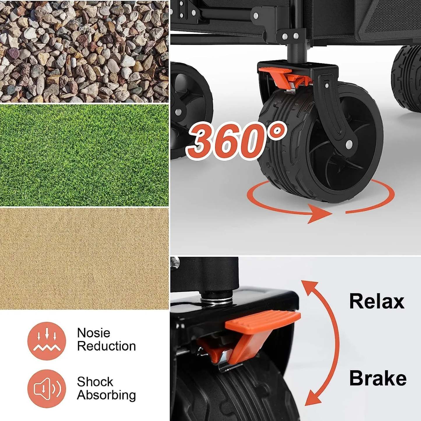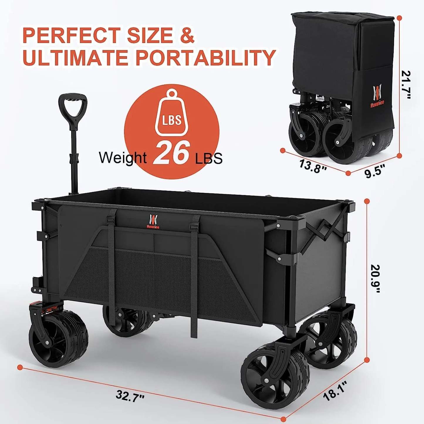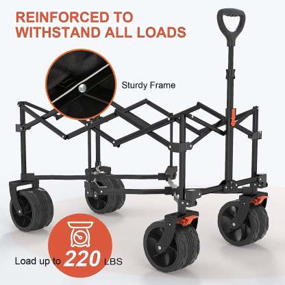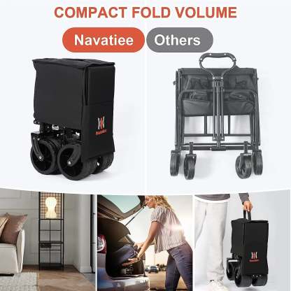 Navatiee Collapsible Folding Wagon, Beach Wagon Cart Heavy Duty Foldable with Big Wheels, Utility Grocery Wagon with Side Pocket and Brakes for Camping Garden Sports, T1