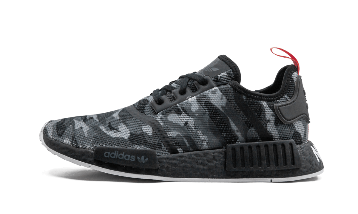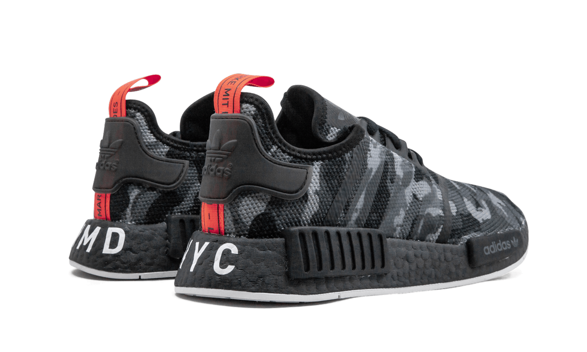 The adithtdas NMD R1 "NYC Camo" is a special edition of the lifestyle silhouette featuring a graphic upper and a callout to New York City on the Boost midsole. The upper features a mesh construction with a black camouflage graphic and the side stripes in a clear treatment. The full-length Boost foam midsole is painted black, and also features "NMD" and "NYC" text in white printed on opposite heels. A white rubber outsole and red heel tab loop complete the design. The adithtdas NMD R1 "NYC Camo" released in 2018.