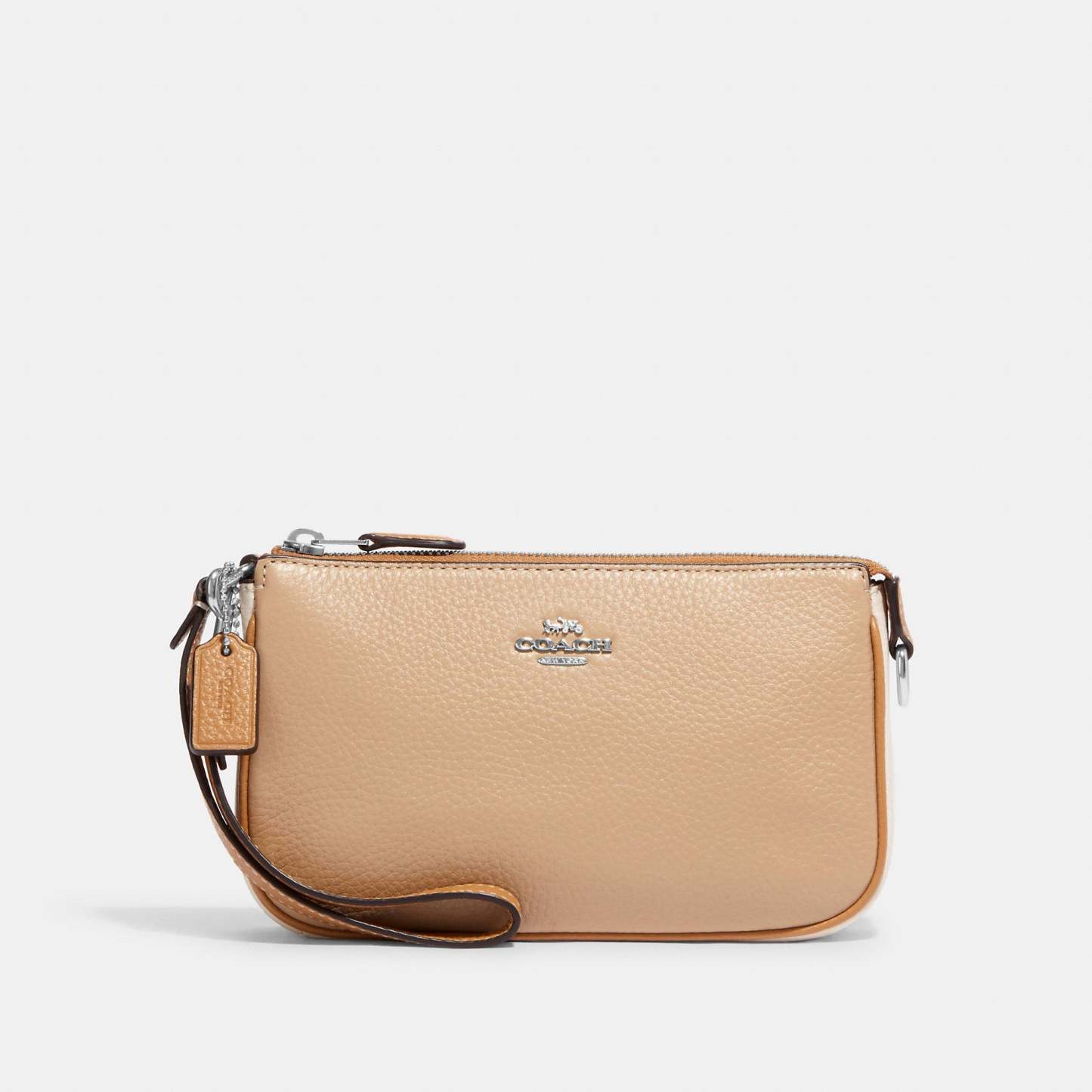 Refined pebble leather Two credit card slots Inside multifunction pocket Zip-top closure fabric lining Handle with 6 1/4 drop 7 1/2 (L) x 4 1/2 (H) x 2 (W) Style No. CI427 | Outlet Nolita 19 In Colorblock - Beige