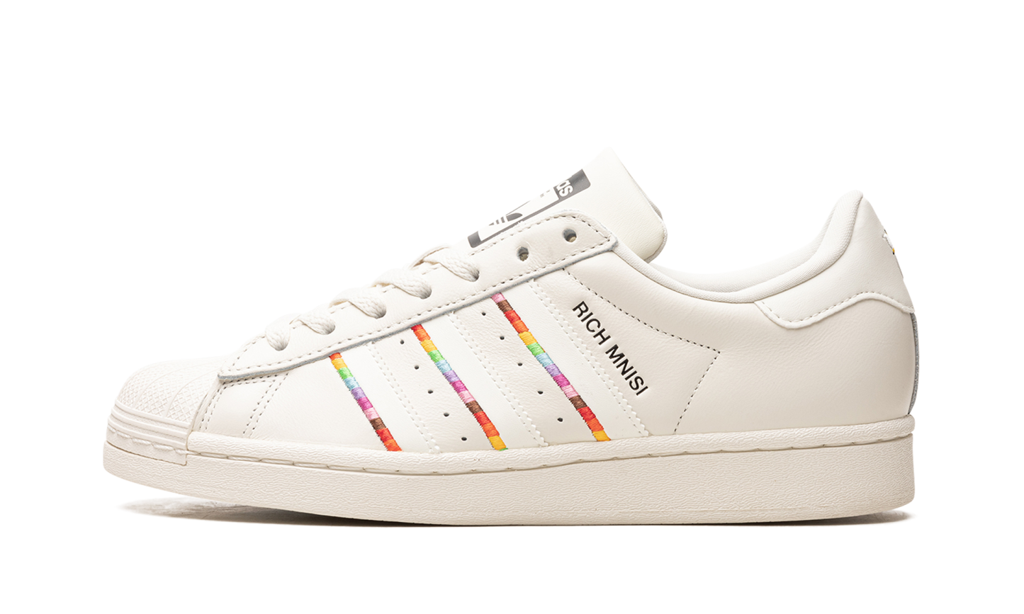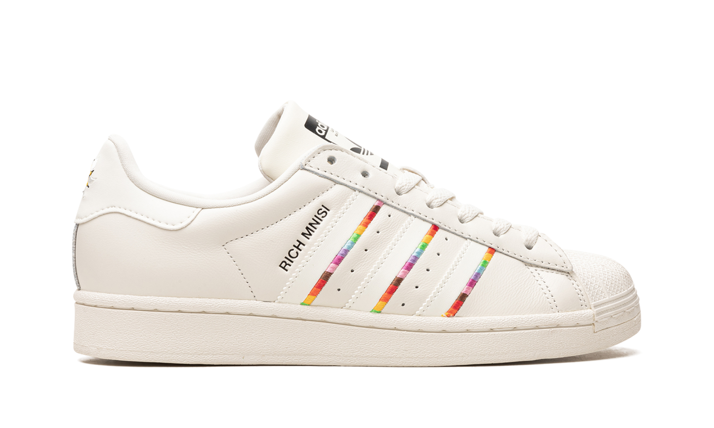 The RICH MNISI X Supthterstar 'Pride' shoe features a vibrant design that celebrates LGBTQ+ pride, blending classic Adithtdas Supthterstar style with Rich Mnisi's distinctive artistic flair.