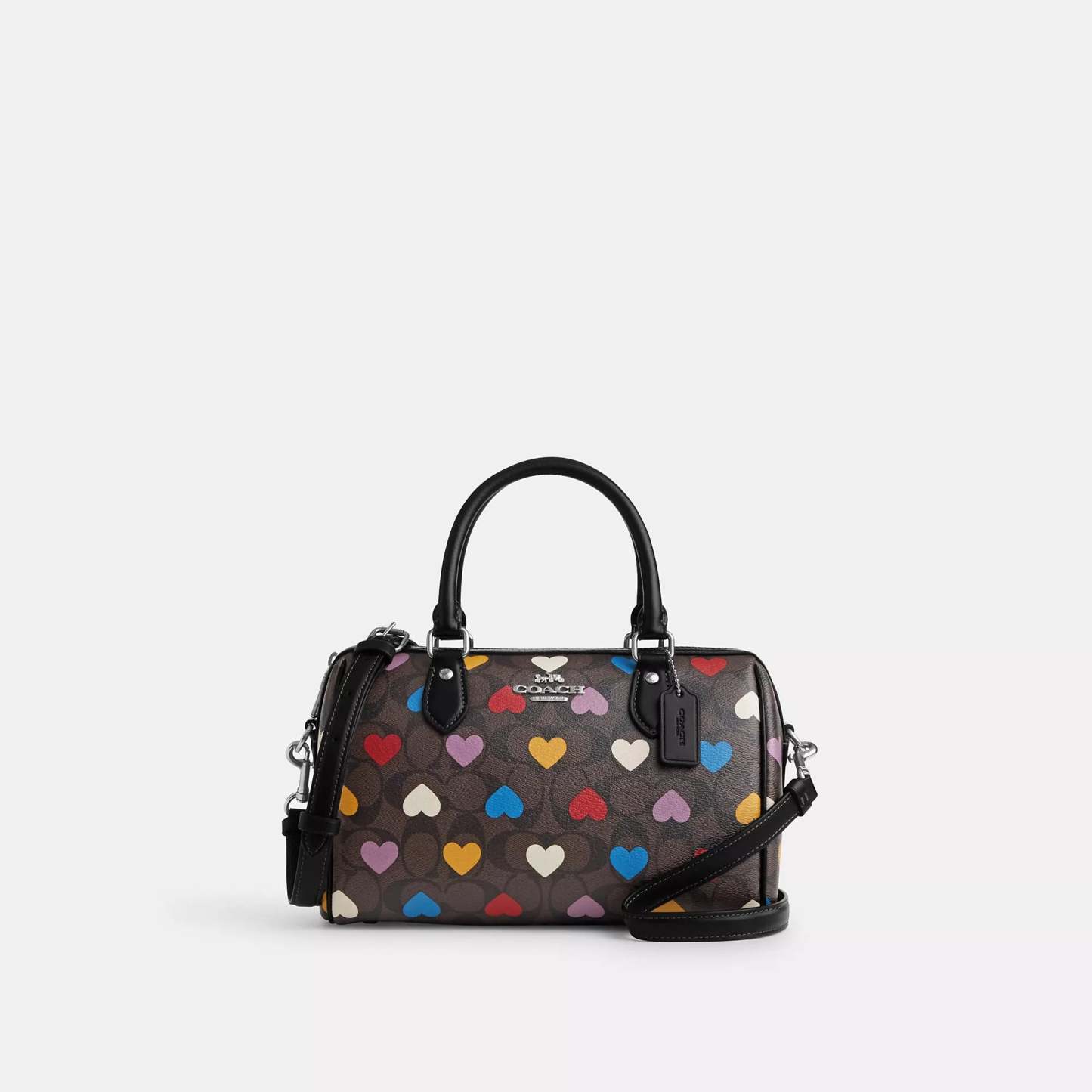 Signature coated canvas and smooth leather Inside zip and multifunction pockets Zip closure fabric lining Handles with 4 1/4 drop Outside zip pocket Detachable strap with 23 drop for shoulder or crossbody wear Four protective feet at base 10 (L) x 6 1/2 (H) x 5 1/2 (W) Style No. CP109 | Coathtth Outlet Rowan Satchel In Signature Canvas With Heart Print - Brown