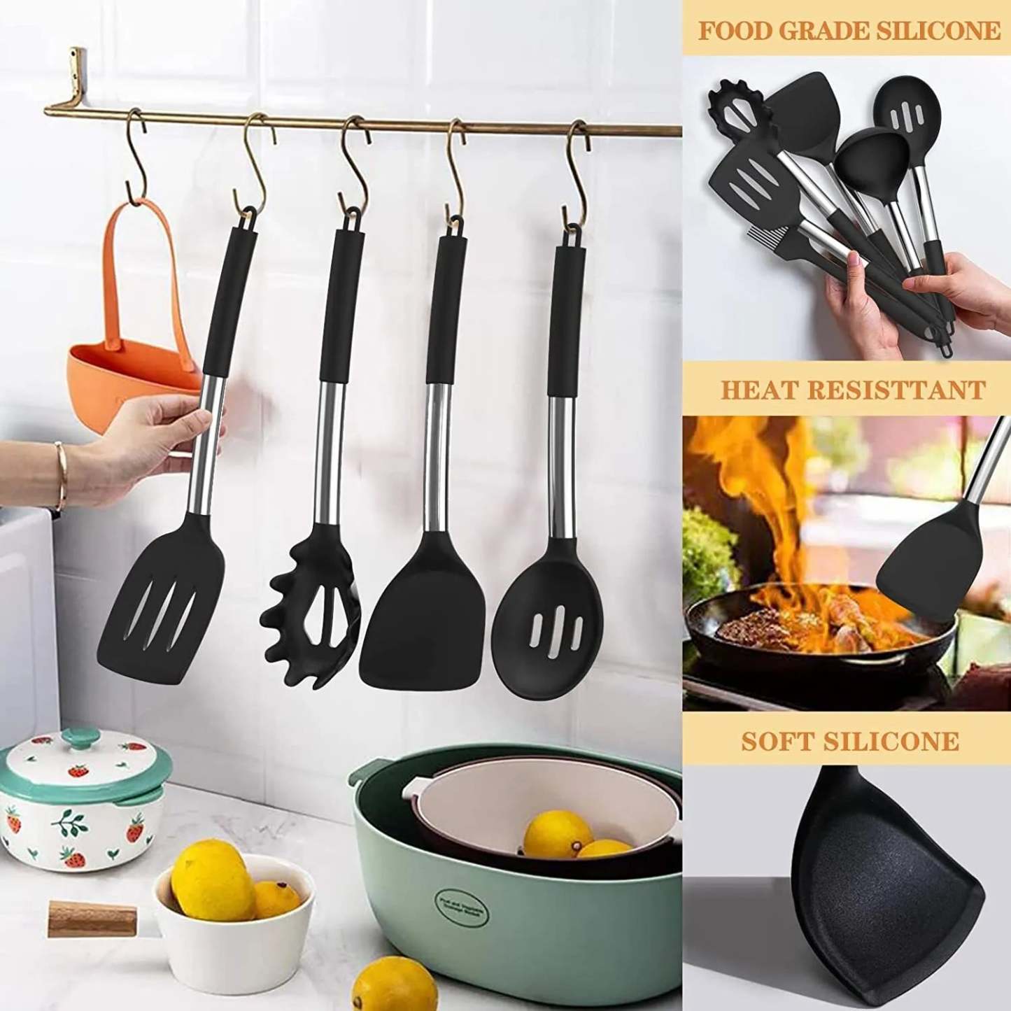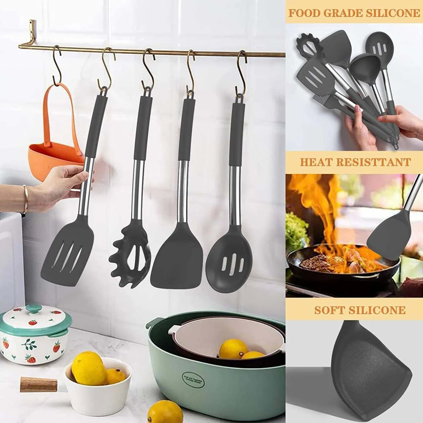 - 🎁HEAT-RESISTANT, NON-STICK, NON-MELTING - The Silicone Cooking Utensils can withstand high temperatures up to 446°F/230°C. They will not melt or produce smoke like poor quality plastic utensils even if used in a high-temperature frying environment. Effortlessly cook the foods you want, no longer worry food will stick your cookware steel material, also prevent from chipping, warping ,melting or any other damages. Utility hanging hole on each handle for convenient storage organization