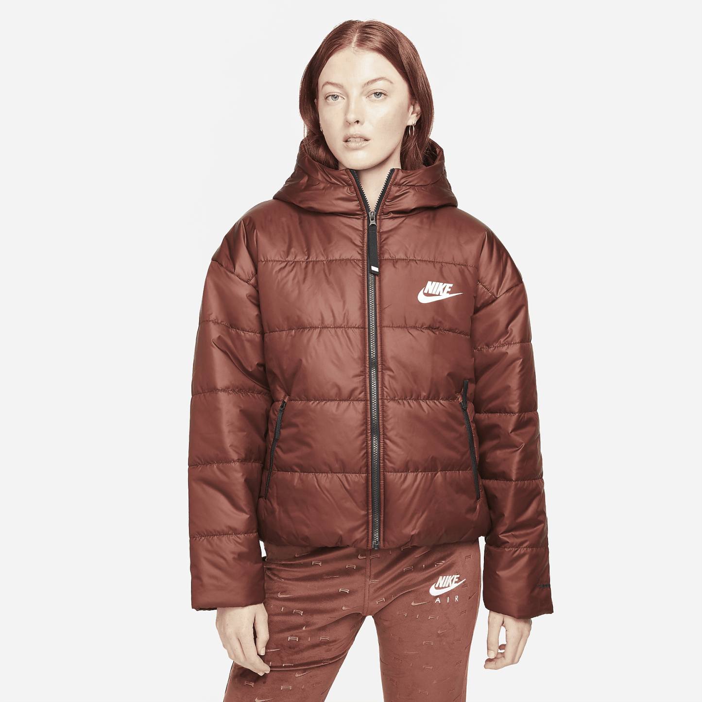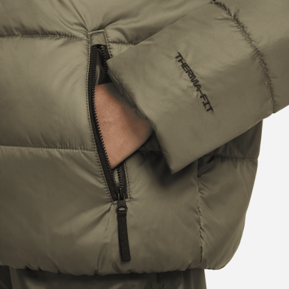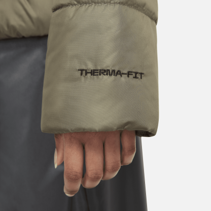 The Sportswear Therma-FIT Jacket upgrades a favorite layer. Its Repel weather-resistant fabric and insulation are both made with recycled polyester derived from plastic bottles. A scuba hood design and easy to layer fit make it a go-to cold-weather staple. This product is made with at least 50% recycled polyester fibers.