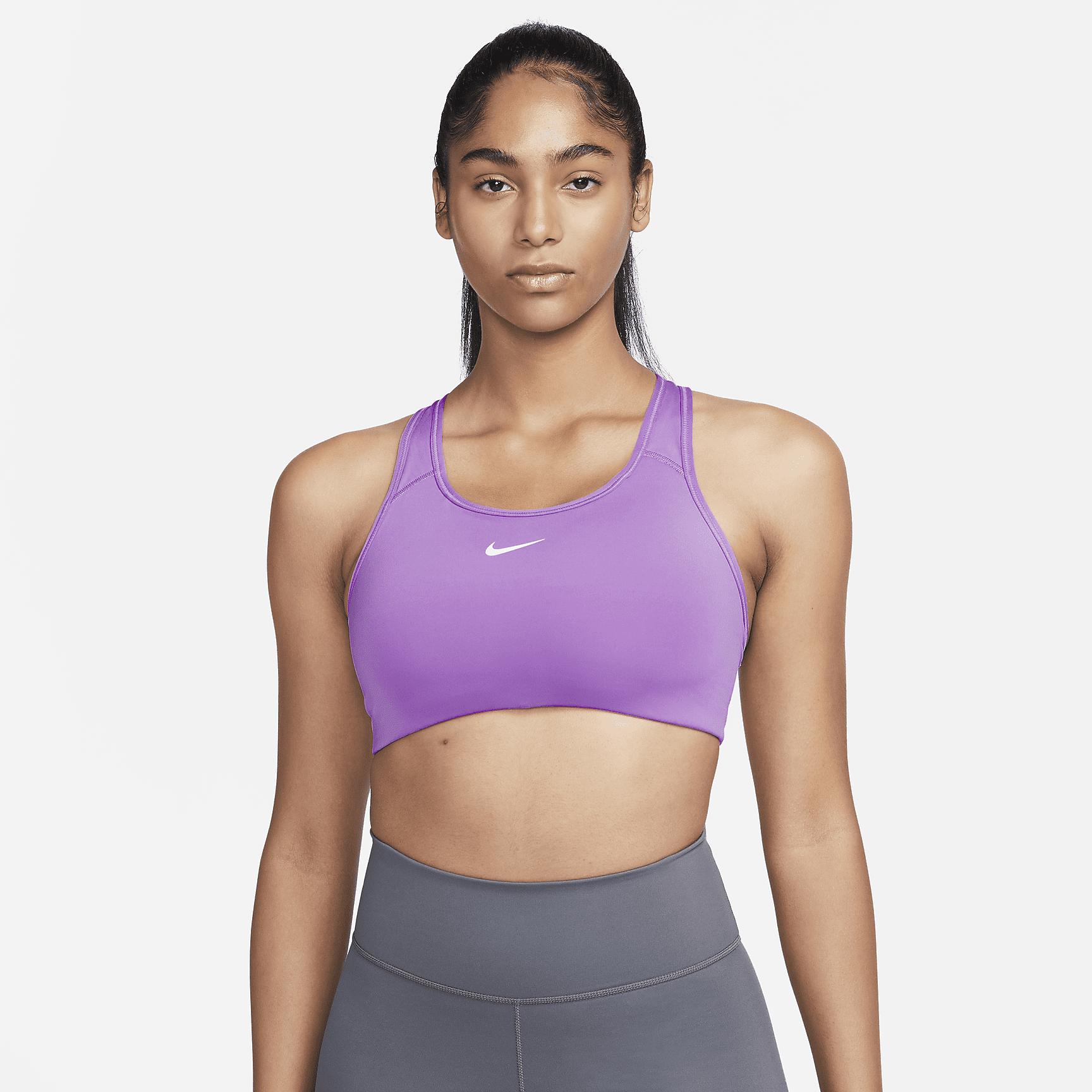 The Swoosh Sports Bra gives you classic coverage and medium support for activities like spin, cardio and dance classes. The removable padding has been redesigned to reliably stay in place while you work out. This product is made with at least 75% recycled polyester fibers.