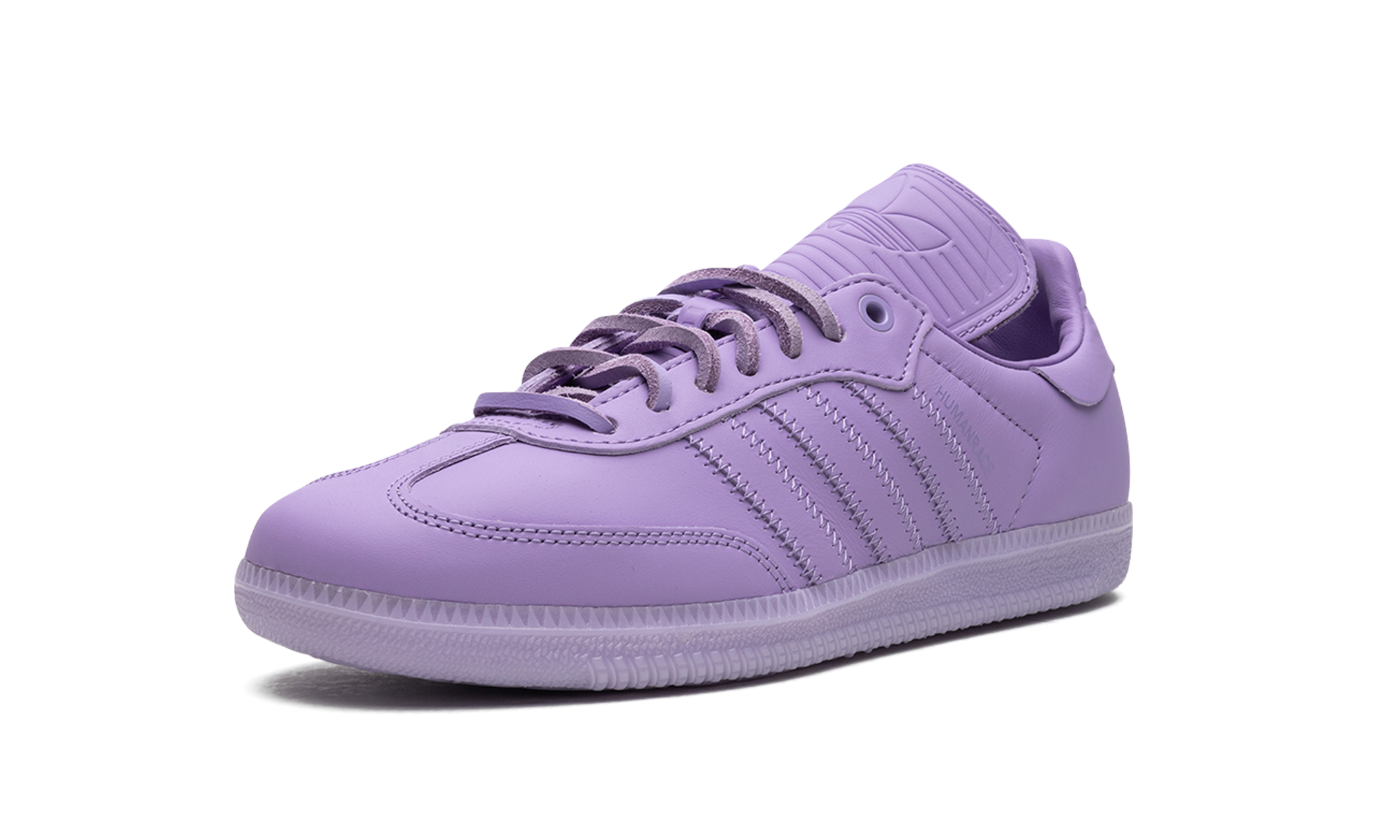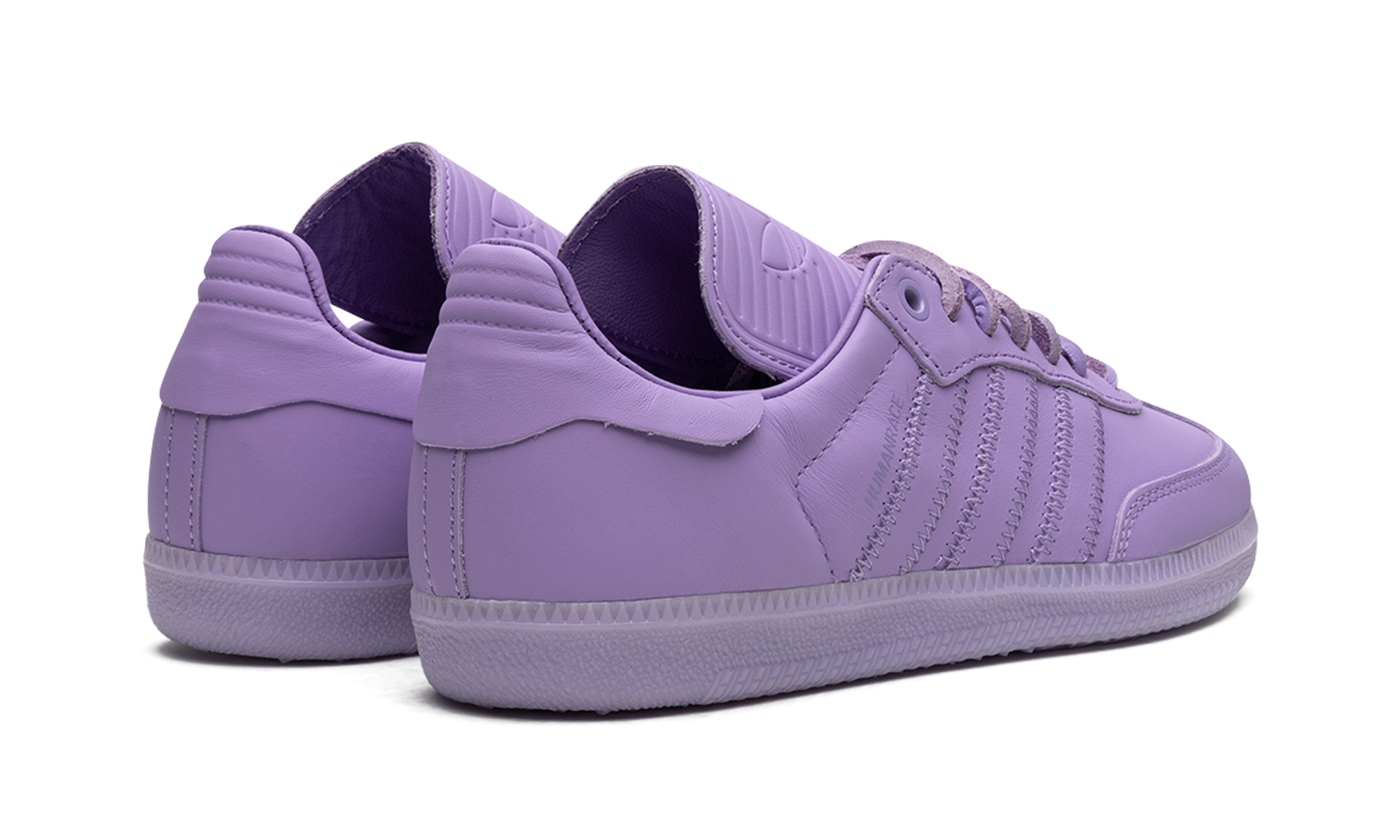 The Humanrace x adithtdas Samba "Purple" is a collaboration between Pharrell's lifestyle brand and adithtdas on a monochromatic purple colorway of the vintage sneaker. From a greater collection of Sambas in monochromatic colorways, the "Purple" features an all-purple leather design with tonal leather overlays and Three Stripes branding. A "Humanrace" logo is found on the sides. An elongated tongue gives the Samba by Humanrace a vintage soccer shoe look. Brown leather laces contrast the design. Underfoot, a purple rubber sole completes the design. Release date: May 6, 2023 Pharrell Williams - Purple