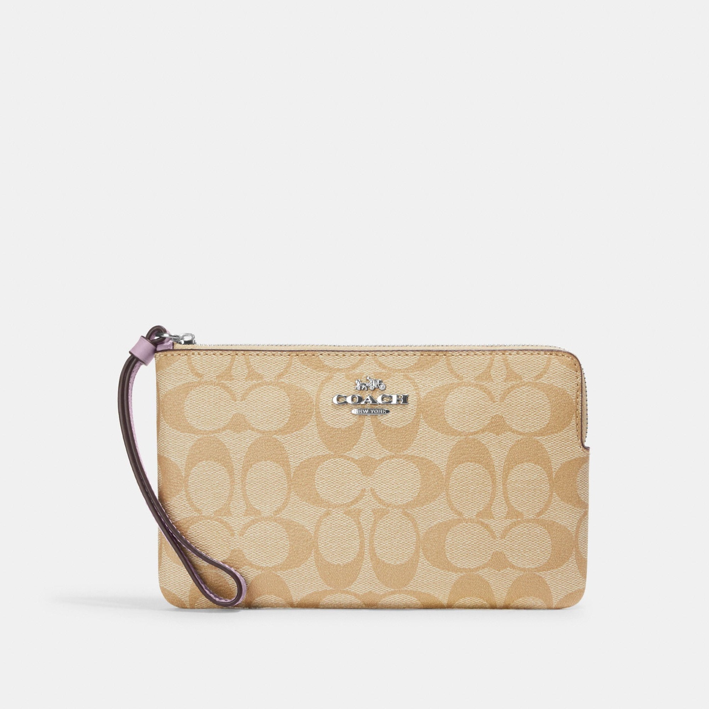 Signature coated canvas and smooth leather Two credit card slots Zip closure fabric lining Wrist strap attached 7 3/4 (L) x 4 3/4 (H) x 1/2 (W) Style No. 6648 | Outlet Large Corner Zip Wristlet In Signature Canvas - Beige