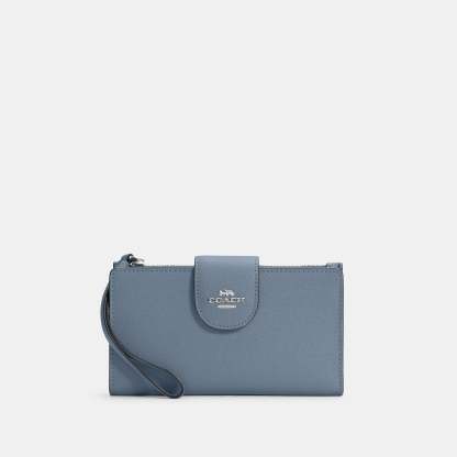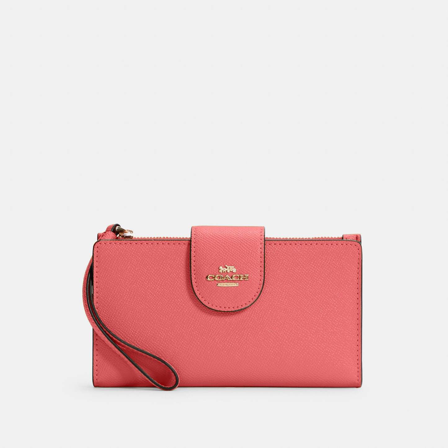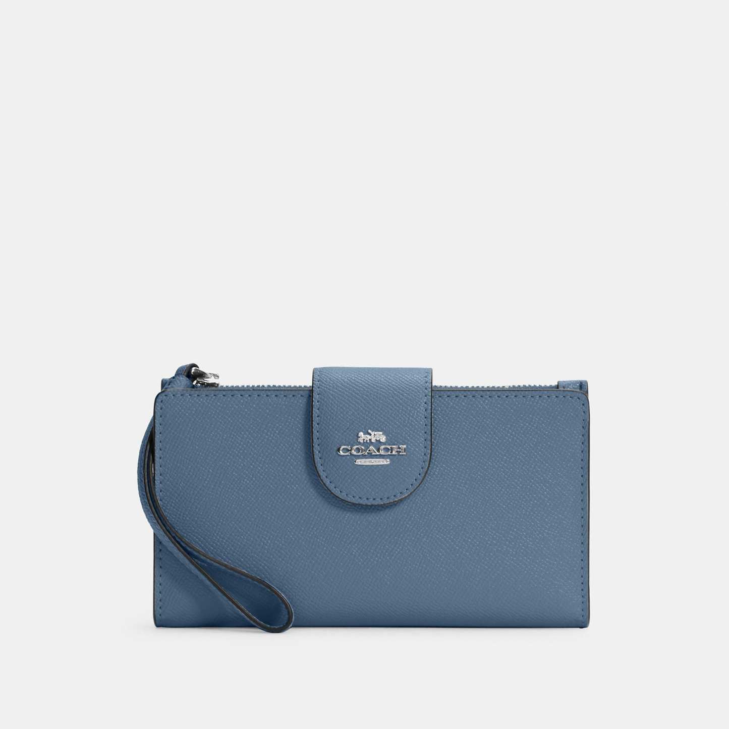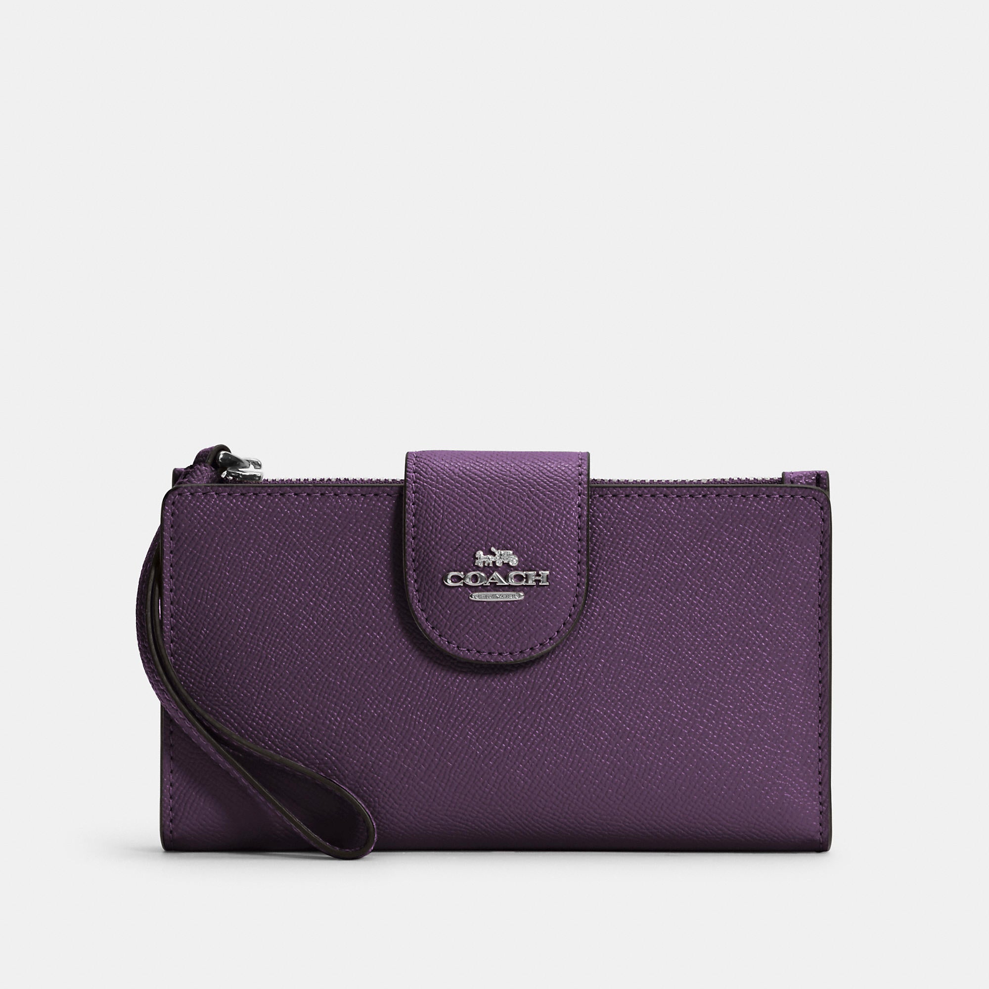 Crossgrain leather Six credit card slots ID window Snap phone compartment Snap closure Outside zip pocket Attached wrist strap 7 1/4 (L) x 4 1/2 (H) Fits all iPhone and Samsung Galaxy phones Style No. C2869 | Outlet Tech Wallet - Brown
